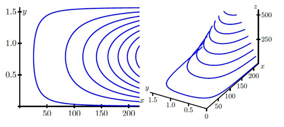 Horizontal traces \(z=f(x, y)=k\) are more often called level curves or contours. Note that if we lift contours and plot them at the appropriate heights, we get a picture of the surface itself.