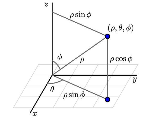 To avoid multiple representations of a single point in space we restrict \(\rho \geq 0,0 \leq \phi \leq \pi\), and \(0 \leq \theta \leq 2 \pi\).